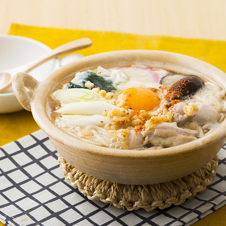 - 一人分の鍋にAの1/4量を入れ、うどんを入れて真ん中を開けて2の具材を彩りよく並べ、加熱して具材に火が通ったら、中央に卵を落とし入れて、その周りに天かすをのせて仕上げる。好みで七味唐辛子をふる。